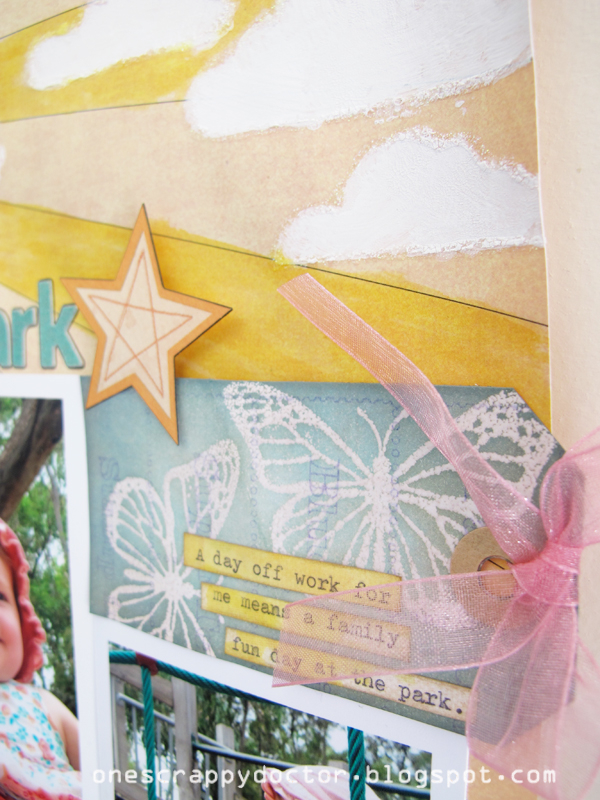 I love the fun and whimsical nature of these papers and embellishments which was perfect for me scrapping these recent photos of Moodles at the park. It's when she was just gaining a lot more strength and confidence walking around, so she was having a ball as she explored her surroundings. Independence hey! She loves it. It scares me :-)