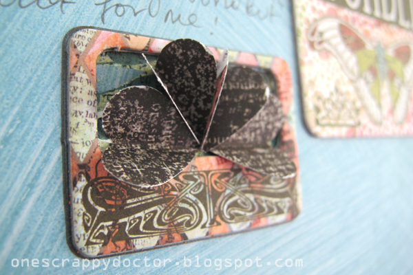 On this page I really wanted to focus on the Out of Print chipboard stickers I received in my kit. It included all these windows and squares that I made into a series of frames. I filled them with little bits and pieces.