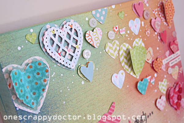 I filled the background with a bunch of pucnhed and hand-cut hearts from the MME Alphabet Soup collection. I took my inspiration for this from a piece in the 7 Gypsies Flikr pool, found via Pinterest. Add in a few more embellishments and details and you're done! I'm so ready to hang this in my girl's room now..... except that it hasn't yet made it past my dining area (much like these Valentine's roses which are now dried to a crisp!)